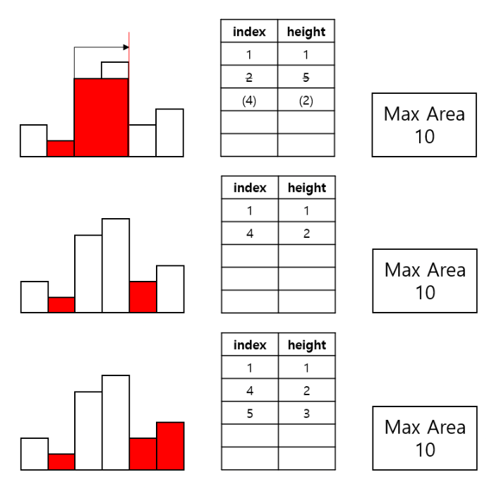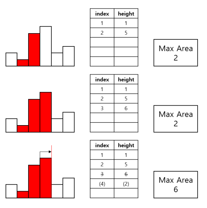 - 더 작은 높이가 나오면 확장할 수 없으므로 직사각형의 넓이를 계산하고, 더 높은 높이가 나오면 확장할 수 있으므로 stack에 쌓자.